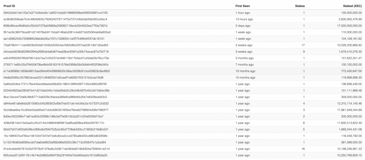 As of this writing, there are 23 avalanche peers in total (source: ecash.coin.dance/avalanche). I’m happy to report that the 23 peers who are staking their XEC today represent a wide range of eCash holders with large and small holders alike. Seven stakers hold more than 10B XEC with the largest at nearly 18B, while ten stakers are doing so with anywhere from 100M to 200M XEC.