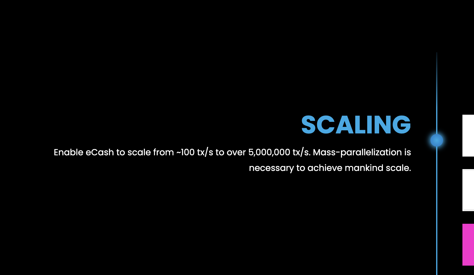 What the eCash project does want to maximize is value creation, and we believe a purely peer-to-peer version of electronic cash will add an enormous amount of value to the world. We believe that the best way to achieve peer-to-peer electronic cash is through massive on-chain scaling. This doesn’t mean eCash isn’ interested in layer two solutions for the right use cases, but that in order to take advantage of layer two solutions first requires scaling layer one.