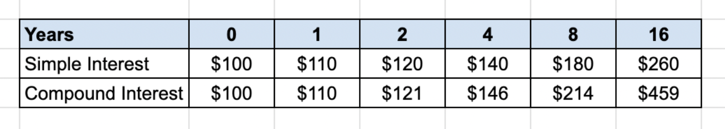 For example, let’s say you start with $100 and earn 10% annually. In the below table you can see how much money you’d have after 1, 2, 4, 8, and 16 years of compounding interest versus non-compounding (simple) interest: