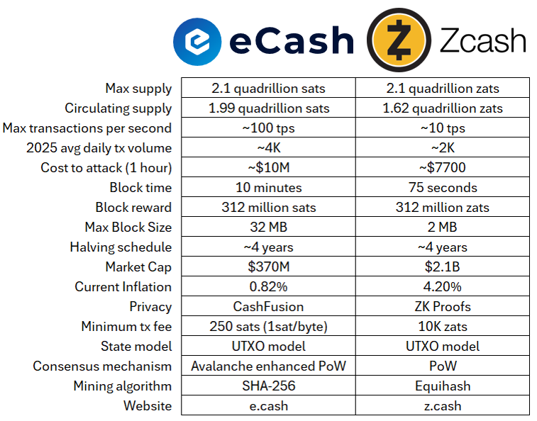 On the other hand, eCash is optimizing for low fees, scalability, and fast payments, while tackling privacy through its CashFusion protocol (an advanced form of coin mixing), with future plans of adding a zero-knowledge subnet that would give users the same level of privacy offered by Zcash. (The advantage of relying a privacy subnet is that the entire UTXO set remains transparent and auditable for eCash, which is not the case with Zcash, forcing users to trust cryptography audits to protect against hidden inflation.)