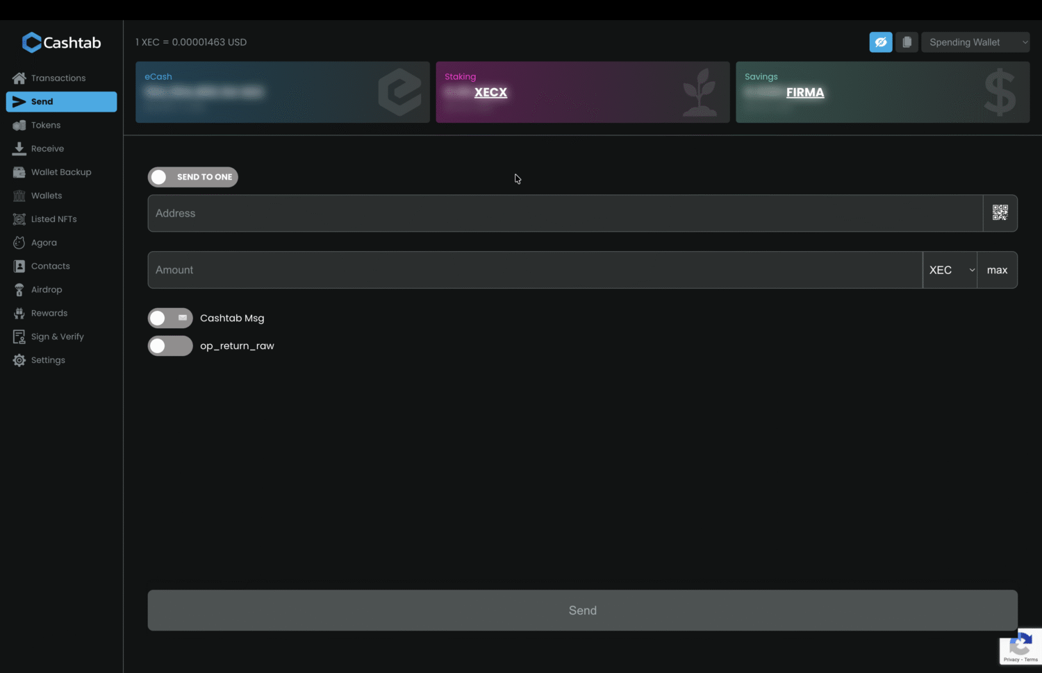 - At the top, you’ll see the price of XEC, your XEC balance, and your XECX and FIRMA balances.