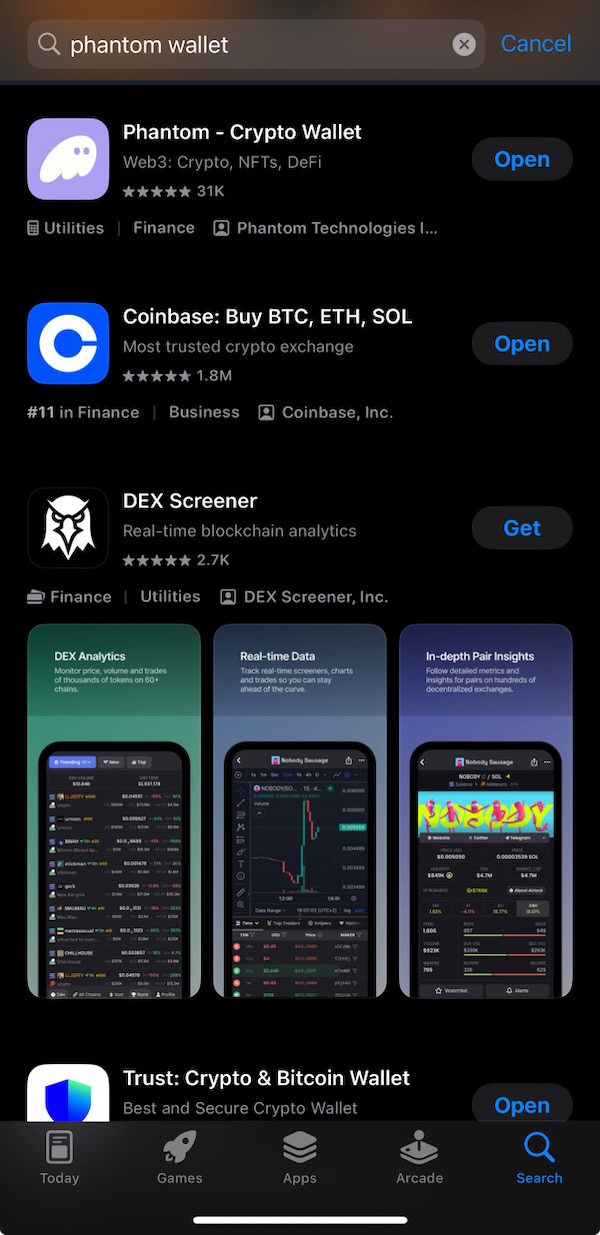 Screenshot of Phantom Wallet and Coinbase on the iOS App Store: