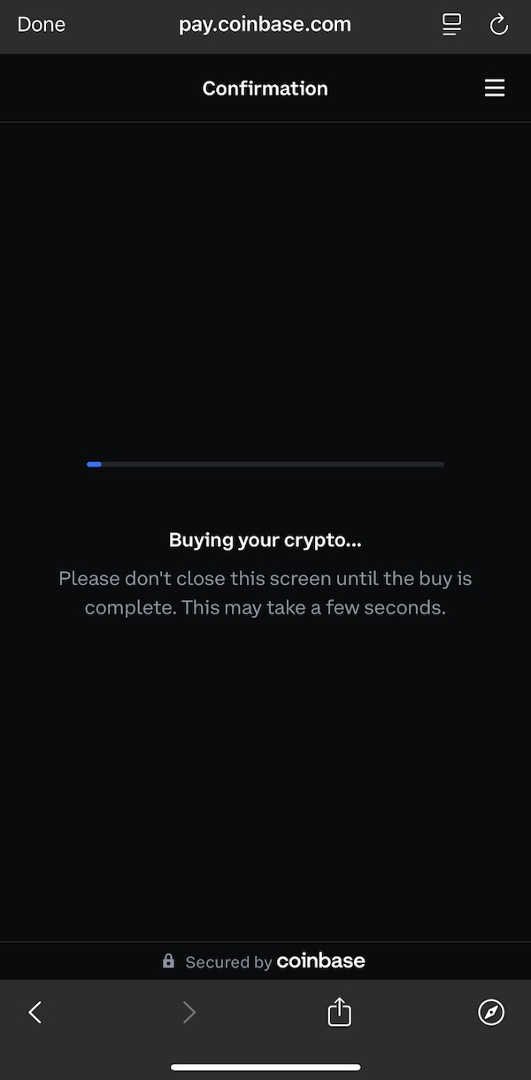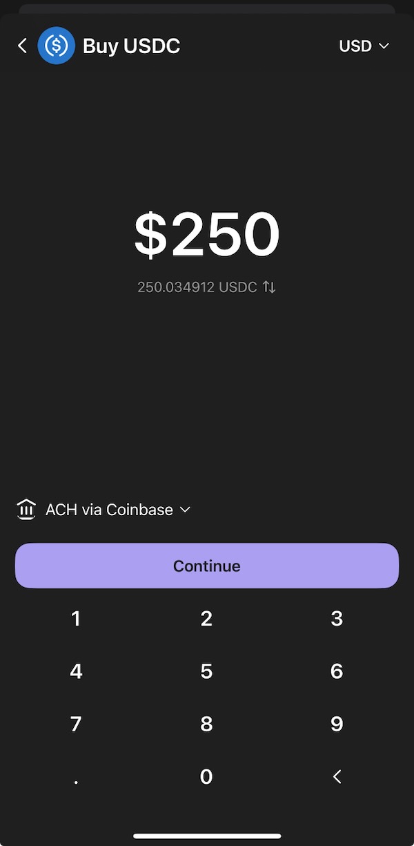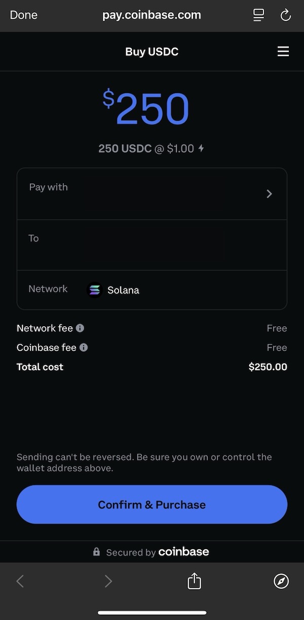 Go back using the top-left arrow in the app to the screen where you typed in your USDC amount and click “Continue” (check to make sure the amount is correct). It will ask you to log into your Coinbase account to use Coinbase Onramp for a no-fee purchase of USDC at a 1:1 ratio with USD. Select “Confirm & Purchase” when you have confirmed that all of the information (amount, source bank account, and destination Phantom wallet address) is correct.