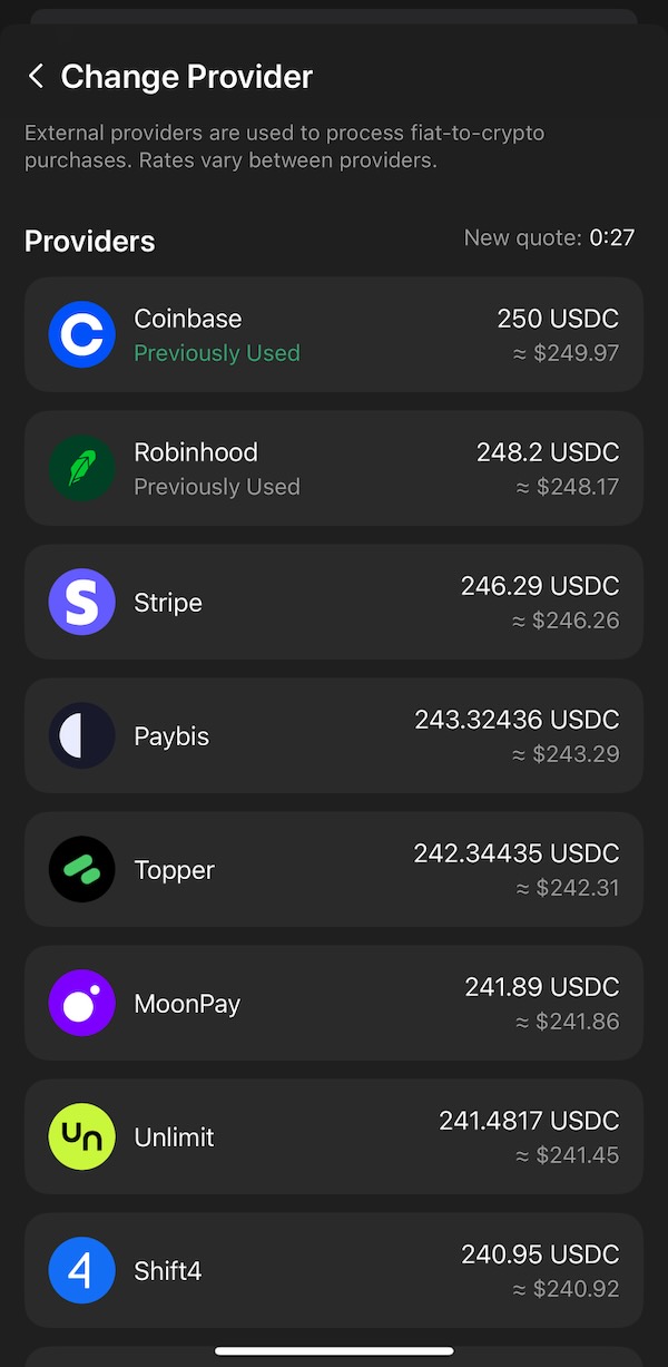 Click on the payment method drop-down (it should say “ACH” or “Apple Pay” or “Debit/Credit Card” with a drop-down arrow next to it; the screenshot above shows it saying, “ACH via Coinbase”), which will take you to a page that says, “Change payment method”. Select Coinbase as the Provider and ACH as the Payment Method (careful—I noticed that changing the Provider second may change the Payment Method you selected).
