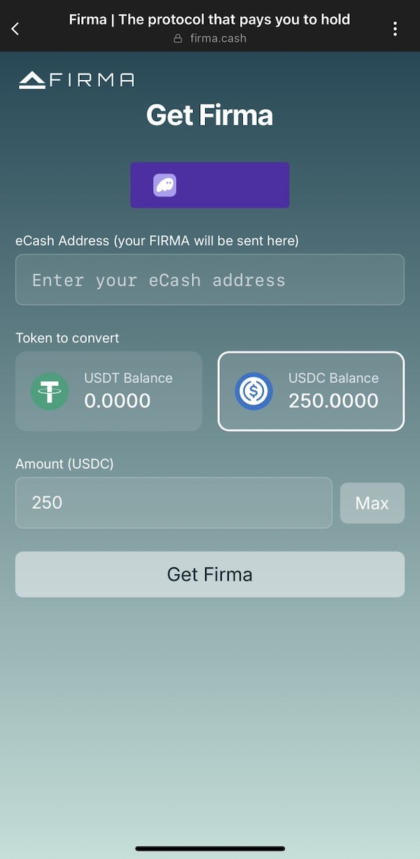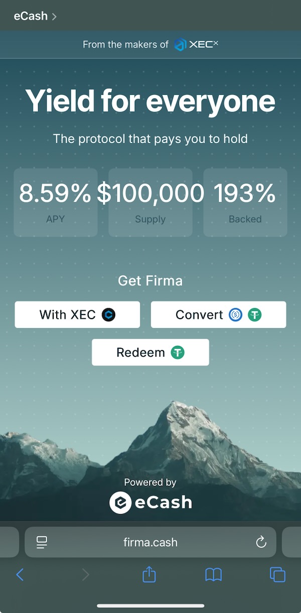 Thanks to FIRMA protocol, you can finally buy XEC in the U.S. at market price for near-zero fees without an exchange. You can also simply convert your USD into FIRMA, which matches USD 1:1 and earns yield while you hold. Here are the steps to convert USD into FIRMA and XEC with a smartphone: