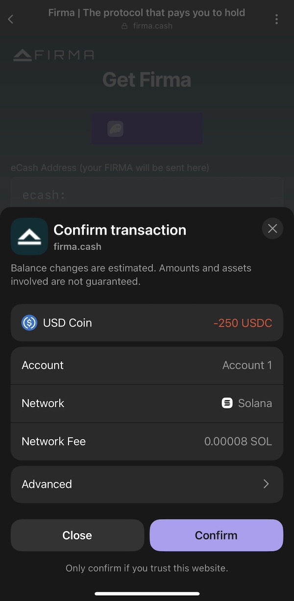 It will then take you to your Phantom Wallet where a browser screen will pop up from within the App. Copy and paste your destination eCash address (i.e., the one that you created a wallet for in Cashtab) into the eCash Address text box. Select your USDC balance and enter the amount you wish to convert. Click “Get Firma”.