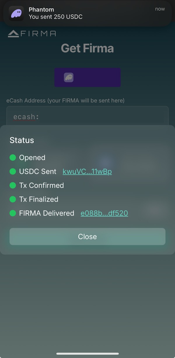 - Check the www.firma.cash site and make sure that they are still converting USDC into FIRMA using the Phantom Wallet.