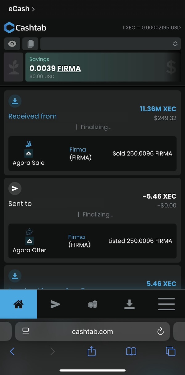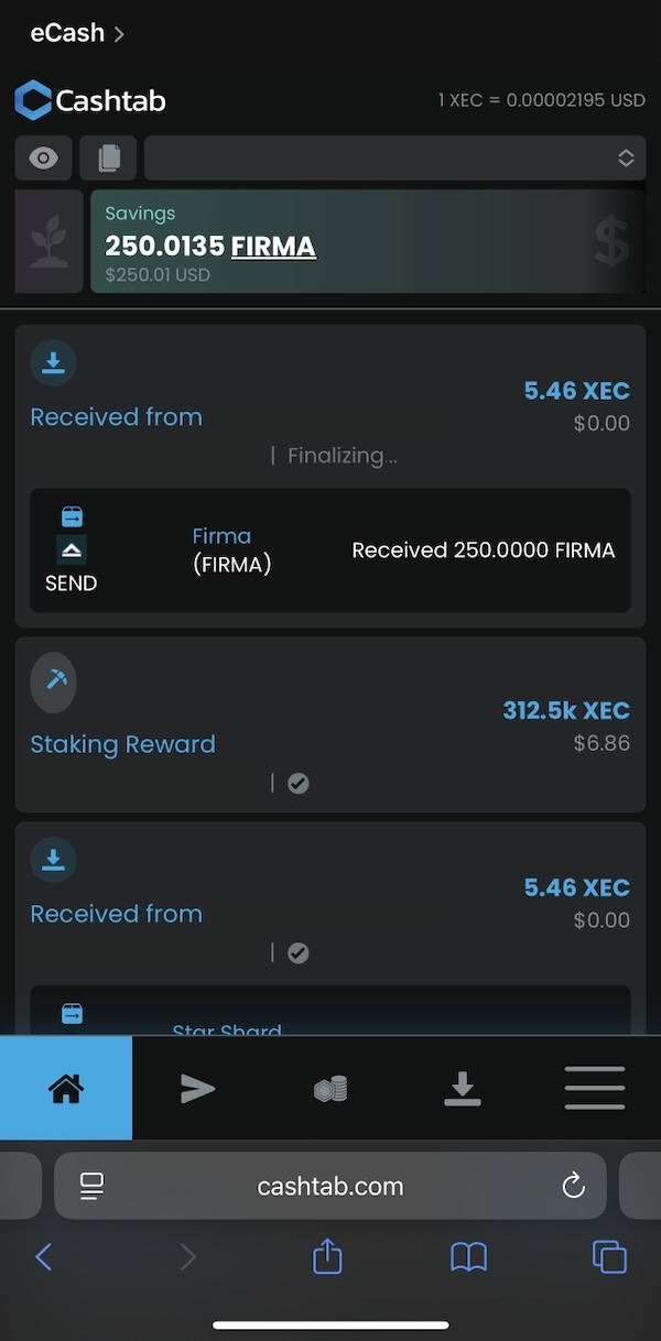In your Cashtab Wallet, your home screen will show the received transaction and, if you slide the top bar with your XEC amount over a couple of times, it’ll switch to your FIRMA amount.
