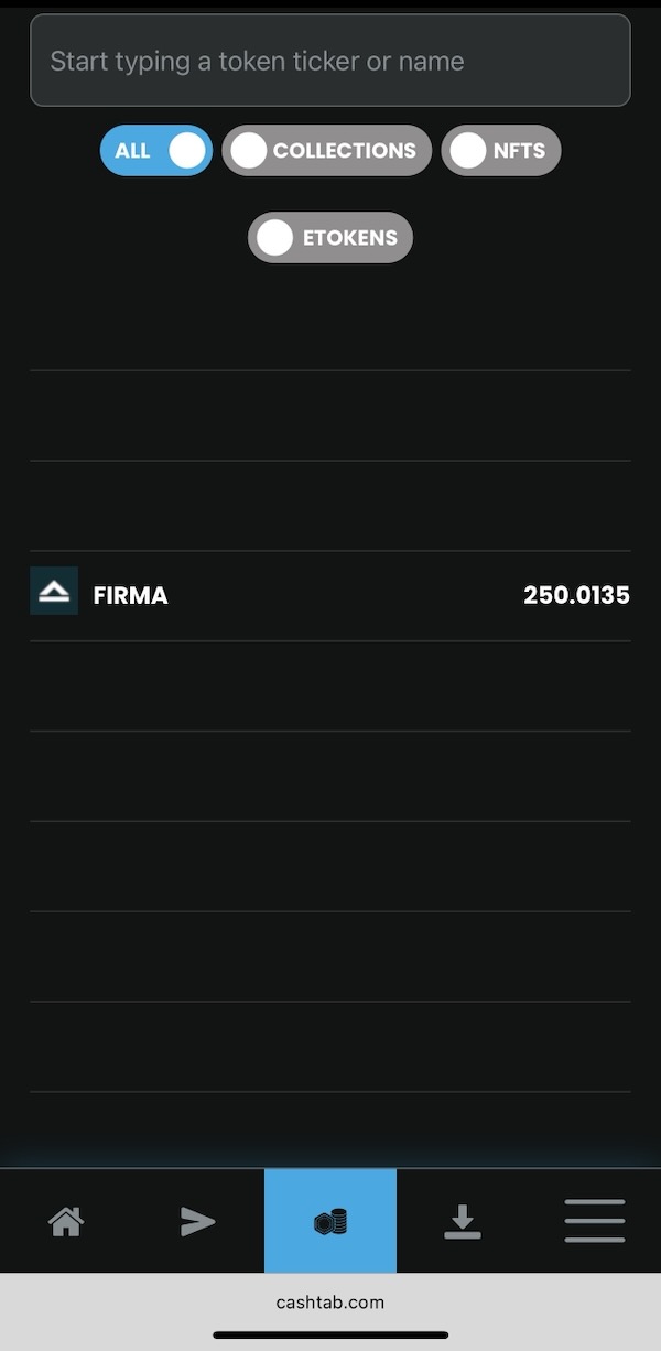 (note: the Cashtab site frequently gets interface updates, so if you don’t see it there, an alternative is to click on the Tokens icon at the bottom and find your FIRMA amount in your token list—in the desktop app, it’d be on the left-hand side under “Tokens”)