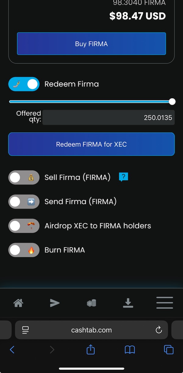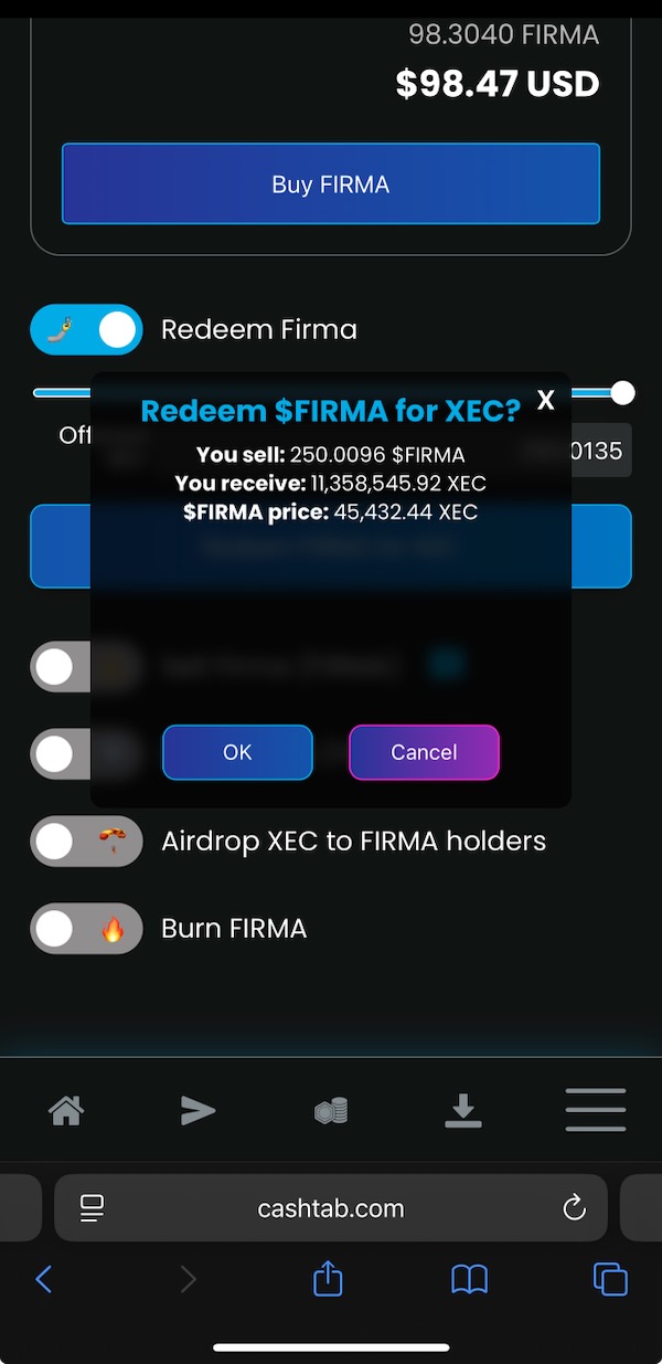Scroll down below the “Buy FIRMA” section to get to the “Redeem Firma” line item. Select it, and then enter the amount (or use the slider) of FIRMA you wish to convert into XEC. It will convert based on the price listed on the top-right of the Cashtab screen (it will also tell you the price on the confirmation pop-up). Select “Redeem FIRMA for XEC”.