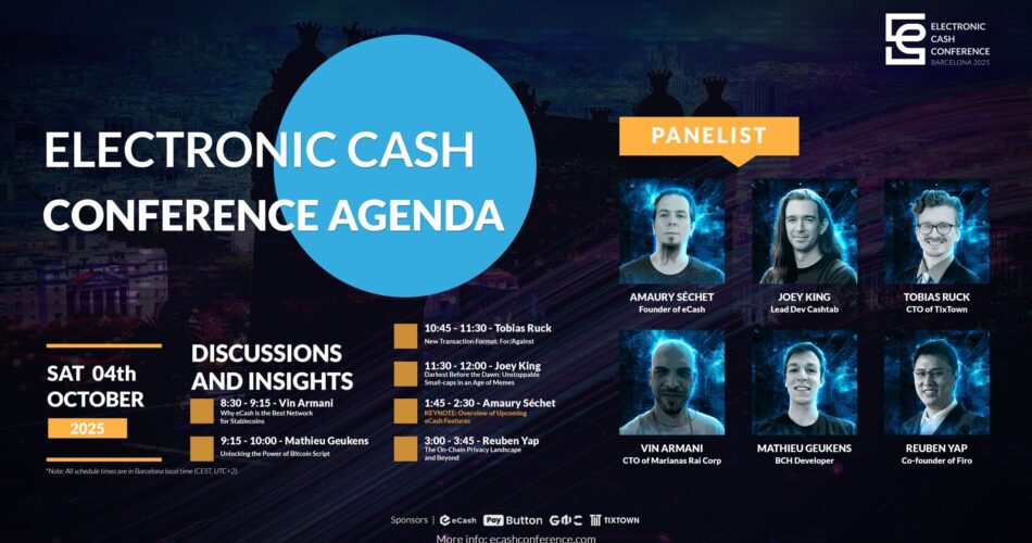 In less than 2 weeks, the Electronic Cash Conference will finally begin in Barcelona, Spain. We will hear from several of the eCash developers, as well as others, who will be talking about things like why eCash is the best network for stablecoins, and a highly anticipated overview of upcoming eCash features.