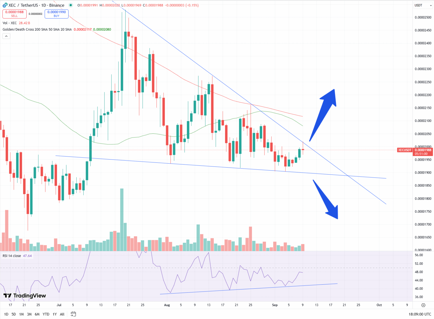 XEC trading volume has also steadily decreased over the past 2 months, which can mean sellers are losing conviction, and there is also a potential golden cross forming with the 200 day and 50 day moving averages (red and green lines in chart) close to each other. They nearly crossed towards the end of August before being rejected.